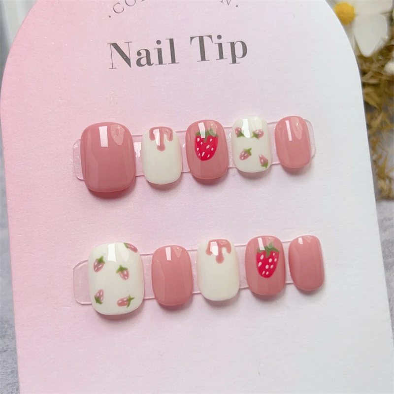10pcs Handmade Press on Nails Round Head Fake Nails Cute Strawberry False Nails Kawaii Short Full Cover Finger Tips Manicure Art